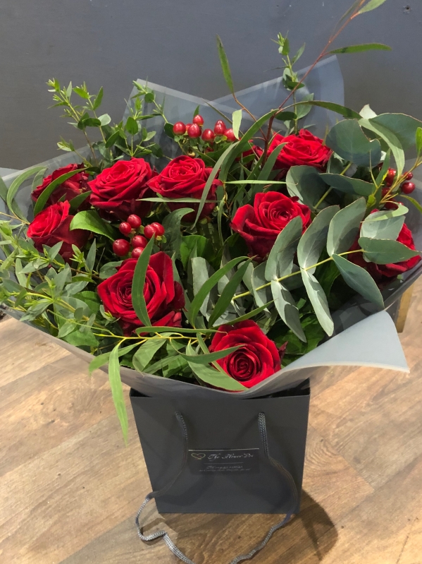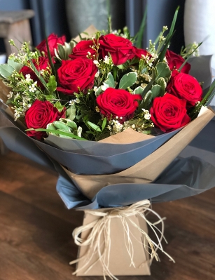 A stunning handtied bouquet containing 12 premium red roses and a selection of exquisite foliage. Delivered in an aqua pack and presentation box.